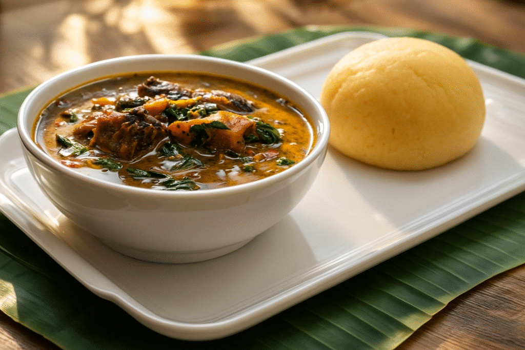 When to serve: Lunch or dinner, strictly with “Swallow” (Fufu, Eba, Pounded Yam, or Amala). It is too thick to eat with rice.